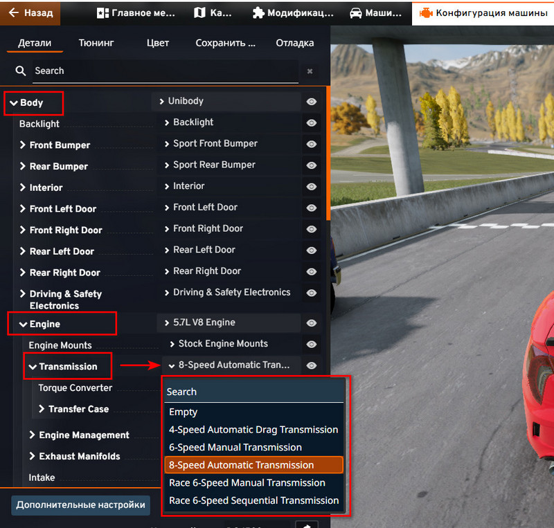 Если затрудняетесь с поиском, используйте функцию поиска в правом верхнем углу меню конфигурации: введите “Transmission” — и система отфильтрует нужные параметры. Это особенно удобно, когда машина состоит из большого количества компонентов, и прокручивать список вручную неудобно.