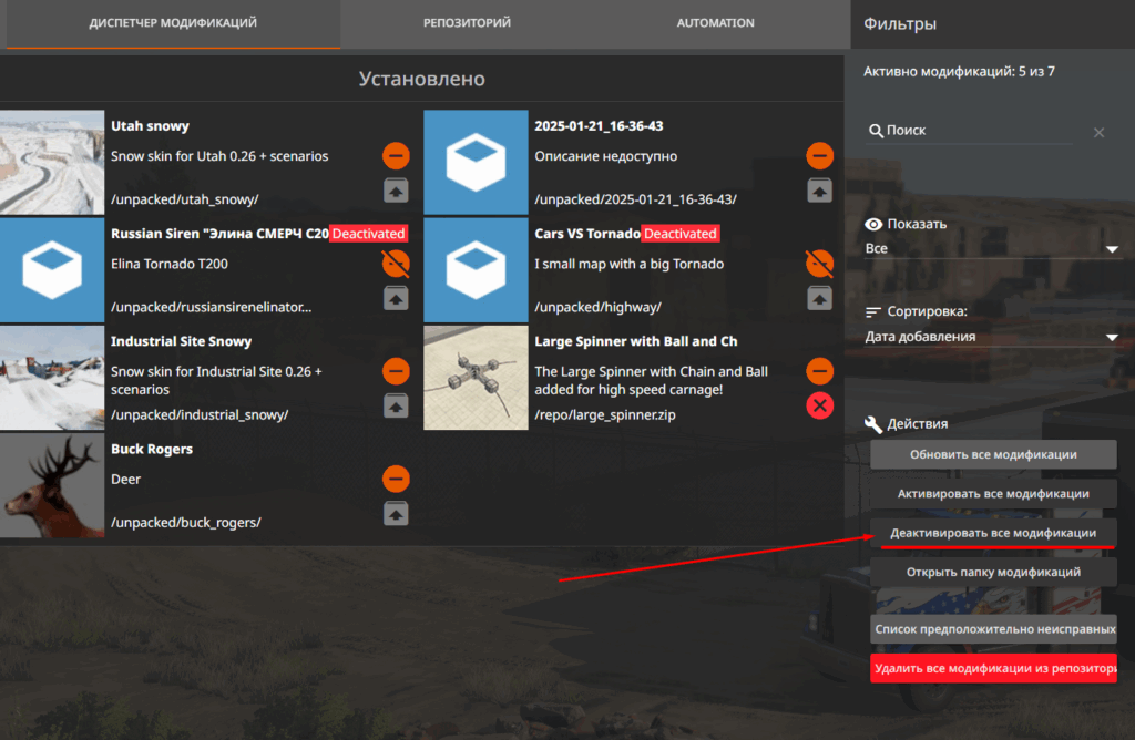 2. Нажми кнопку «Деактивировать все модификации» в правом нижнем углу